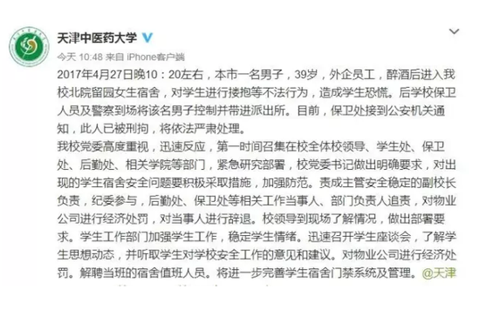 男子喝醉后闯入大学女生宿舍 对女生搂搂抱抱