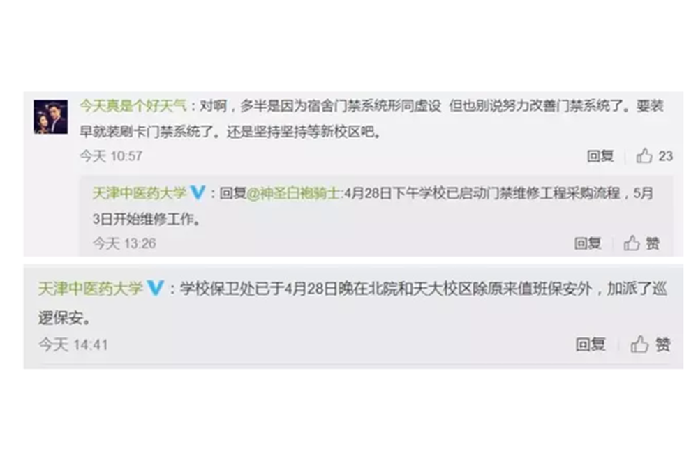 在社交媒体上,天津中医药大学表示加大了安保力度。