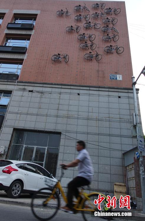 北京16辆自行车“集体上墙”吸引眼球