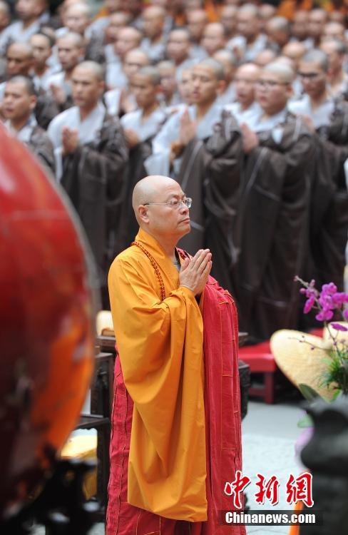 杭州灵隐寺光泉法师带领众多僧人在大雄宝殿前举行祈福法会。 张茵摄