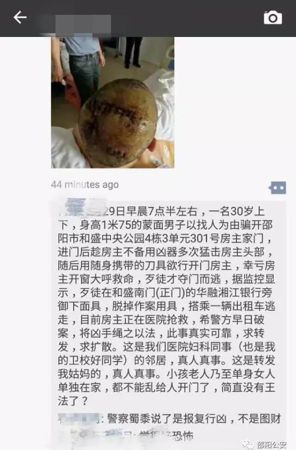 随后,这起案件在邵阳市的微信圈中广泛传播,甚至有传言这是一起恶性入室抢劫案,引发部分市民的恐慌。