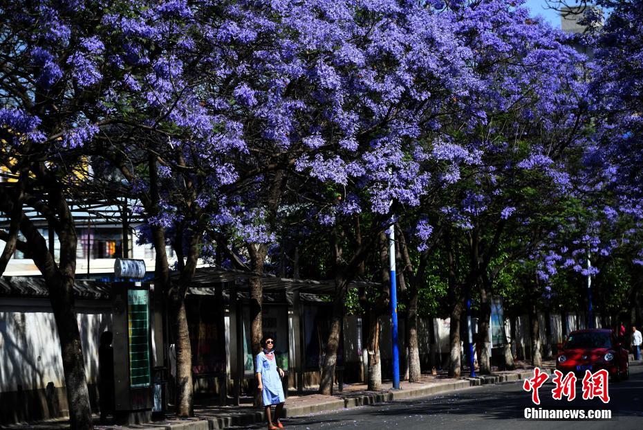 5月5日,穿行在蓝花楹花海下的民众和机动车。近日,云南省昆明市教场中路道路两旁的蓝花楹盛放,紫蓝色的花朵在蓝天白云的映衬下格外美丽,花随风落,吸引众多民众参观留影。据悉,蓝花楹于1984年首次由中科院昆明植物研究所从阿尔及利亚引进昆明,该景观树高大优美,在昆明适应性良好,每年的春末初夏盛放,花期只有10至20天左右。中新社记者 李进红 摄