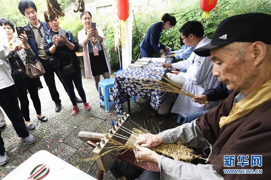 5月5日,市民在观赏传统的“箬叶编草鞋”表演。