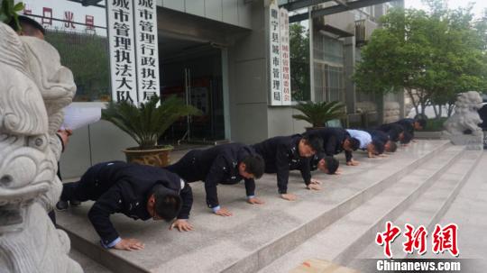 中新网南京5月6日电 最近两天,一组城管队员被罚做俯卧撑的图片,在徐州市民微信朋友圈走红,引起网民热议。5月5日下午,江苏省睢宁县城管局执法大队副大队长汤惠朝称,这是该局近期针对整治非机动车乱停乱放而出台的新举措,凡是辖区内发现问题而不及时处理,该辖区城管队员就要被“罚”做俯卧撑,同时分管片区的城管队长也要“连坐”。