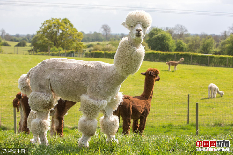 2017年5月5日讯(具体拍摄时间不详),53岁的Helen Kendall Smith给他饲养的羊驼剪了新的造型,使它们看上去像恐龙,以此庆祝她饲养动物十周年。她每年要给这些羊驼剪毛,否则会引起它们的困扰,今年她有个不一样的想法就是把它们剪得像恐龙。swns/视觉中国