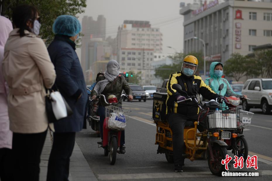 5月6日,内蒙古通辽市街头,民众戴口罩、裹纱巾应对沙尘天。近日,来自内蒙古西部与蒙古国南部的沙尘席卷中国多地,位于内蒙古东部的通辽市自3日起,连续4天出现空气质量指数爆表的情况,沙尘借助大风让整个城市处在灰色之中。中新社记者 刘文华 摄