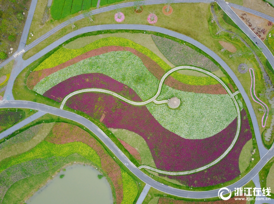 鸟瞰杭州余杭区径山镇潘板桥村的“千花里”景区,缤纷绽放的千亩花海宛如巨幅地毯。
