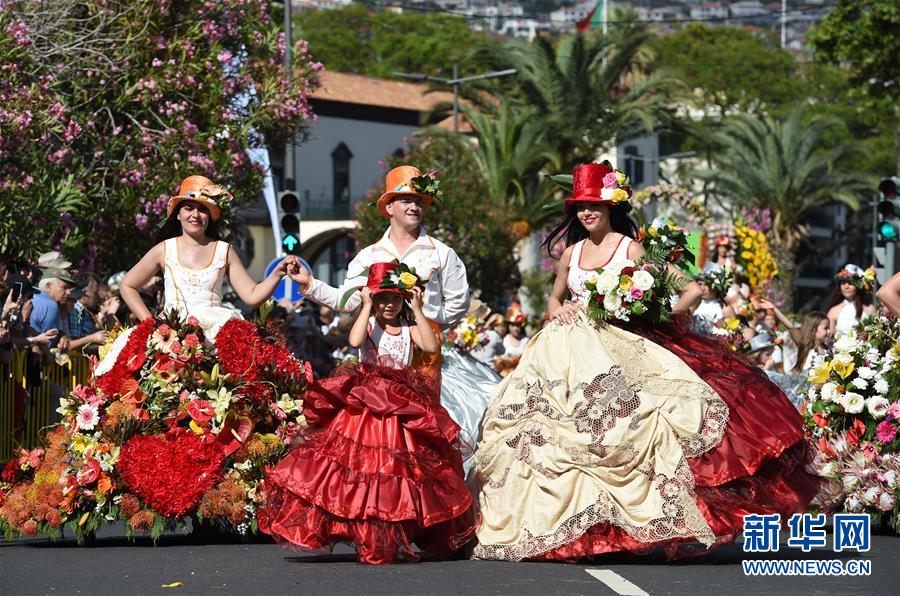5月7日,在葡萄牙马德拉自治区首府丰沙尔,人们参加鲜花节花车巡游。
