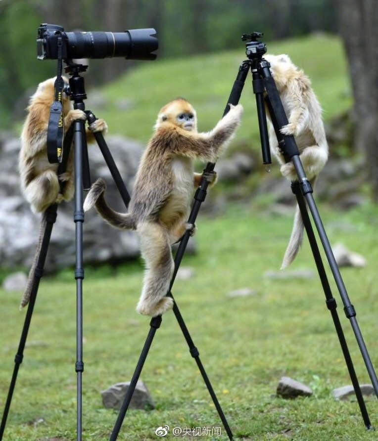 近日,有摄影师去秦岭采风,偶遇几只金丝猴。它们对摄影器材特别感兴趣,爬上三脚架,东摸西看。摄影师也不敢动,怕惊着它们摔了器材。网友:别逗了,人家是国家一级保护动物,比器材贵重多了!(央视记者谭海梅)