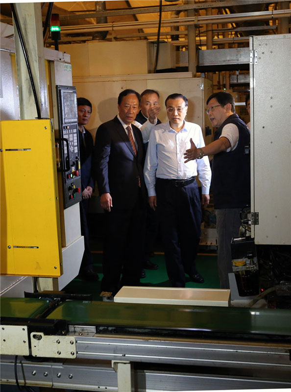 【李克强勉励富士康员工珍视两种精神】李克强9日考察郑州富士康科技园,先来到富士康全球首个智能生产无人车间,随后走进2000多人的精密组装测试车间。总理关切询问工人收入和防护等情况。他最后寄语这里的员工,投身先进制造业尤其要珍视两种精神:一是精益求精的工匠精神,二是永不止步的创客精神。