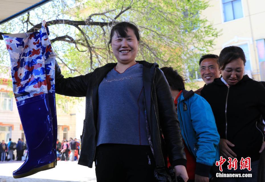 5月9日清晨,满载着1400多名“插秧客”的K7085次列车由黑龙江省绥化站出发,驶向黑龙江产粮腹地——三江平原。时下,正是中国最大“粮仓”黑龙江的插秧季节,哈尔滨铁路局至16日每日开行两对四列“插秧专列”,预计将有超3万人次的“插秧客”被运送到春耕一线。据了解,哈尔滨铁路局已连续开行18年“插秧专列”,累计运送“插秧客”155万人。图为插秧客展示她的新水靴。中新社记者 王舒 摄
