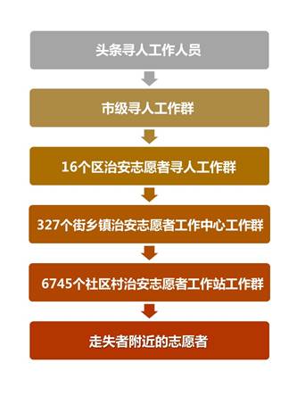 目前,首都治安志愿者协会已经搭建起市、区、街乡镇、社区村四级的组织网络,志愿者队伍遍及全市。之后,首都治安志愿者协会将联合头条寻人志愿者联盟,建立四级寻人微信工作群,开展线下寻人工作,使走失者附近的志愿者可以快速了解寻人信息,帮助寻找走失者,提高寻人成功率。
