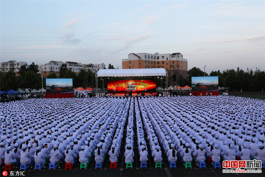 2017年5月11日晚,成都,成都铁路卫生学校举办建校70周年暨国际护士节庆祝活动,逾3000名学生身着白色护士服,整齐划一端坐操场庆祝节日,场面宏大壮观。高寒/东方IC 摄