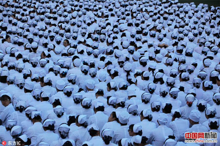 2017年5月11日晚,成都,成都铁路卫生学校举办建校70周年暨国际护士节庆祝活动,逾3000名学生身着白色护士服,整齐划一端坐操场庆祝节日,场面宏大壮观。