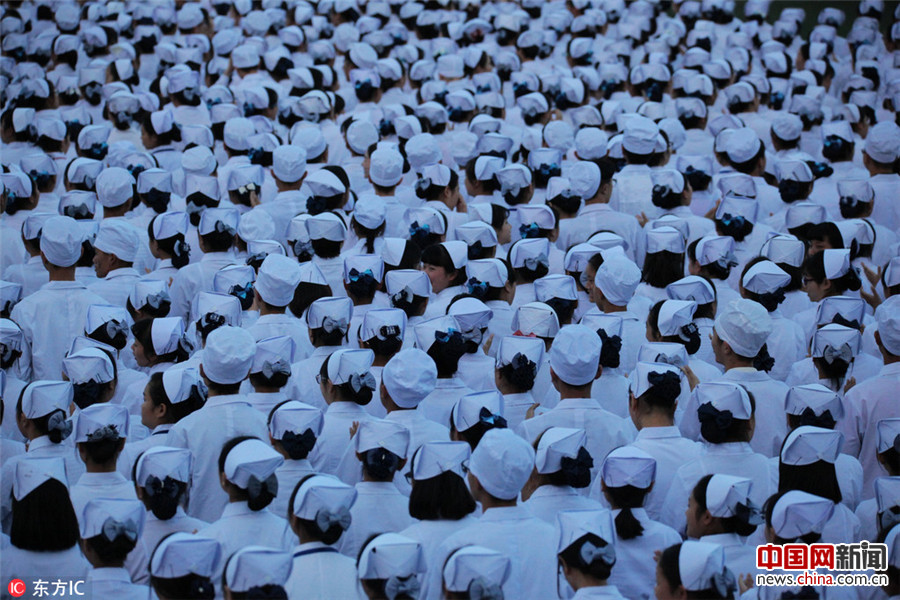 2017年5月11日晚,成都,成都铁路卫生学校举办建校70周年暨国际护士节庆祝活动,逾3000名学生身着白色护士服,整齐划一端坐操场庆祝节日,场面宏大壮观。