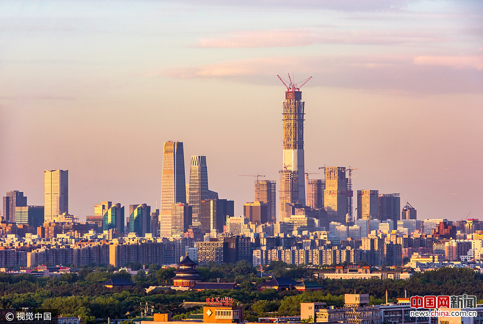 2017年5月14日,傍晚,“一带一路蓝”、“丝路云”照亮北京。前景天坛,远景国贸,古粹今辉,交相呼应。马健/视觉中国