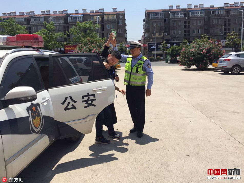 2017年5月17日,安徽芜湖,30分钟后,小费病情稍有好转,考虑到自己离家较远怕耽搁时间,他再次要求现场周警官能否让自己继续参加科目四考试。周警官在征求医生同意后,亲手帮助小费举着装有生理盐水和营养液的瓶子重新来到考场。交警帮助小费去考场场景。老春/东方IC