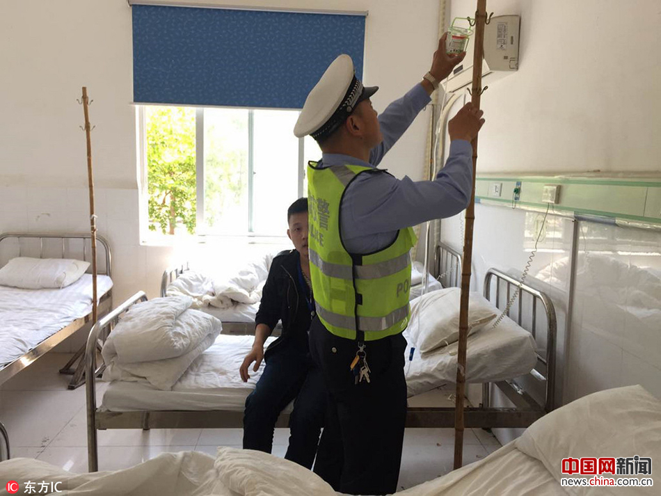 2017年5月17日,安徽芜湖,到达医院后,小费已不能走路,周文斌搀扶着他到了诊室。医生检查了小费情况后,确诊了他说的病情。由于小费身体一时无法动弹,周警官帮忙交钱、拿药,并扶着他到输液室进行治疗。图为交警大哥帮助小费。老春/东方IC