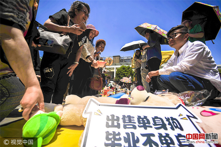 2017年5月17日,上海同济大学闲鱼毕业市集,老阿姨们争相询问小陈的个人信息和家庭情况,还把自己女儿照片拿给小陈看,争相要把女儿介绍给小陈做女朋友。(蓝镜/视觉中国)