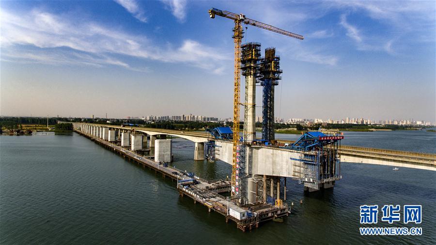 由中铁十一局集团承建的蒙华铁路汉江特大桥主墩和索塔(5月17日摄)。蒙华铁路汉江特大桥位于湖北省襄阳市区上游约3公里的汉江上,总长5242米,是蒙华铁路重点控制性工程之一。该桥江面共18座桥墩,位于江面上的主桥为双塔五跨部分斜拉桥,最大跨径248米。据了解,蒙华铁路汉江特大桥目前建设顺利,施工难度最大的主桥斜拉索索塔将于本月底完成封顶。蒙华铁路全长1800多公里,线路北起内蒙古浩勒报吉站,终点到达江西省吉安,计划2020年建成开通,是继大秦线之后我国又一条新建超长距离的运煤大通道。新华社记者杜华举摄
