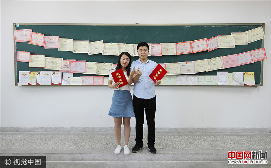 2017年5月16日,安徽淮北,学生情侣将证书挂在黑板上拍写真。洪康/视觉中国