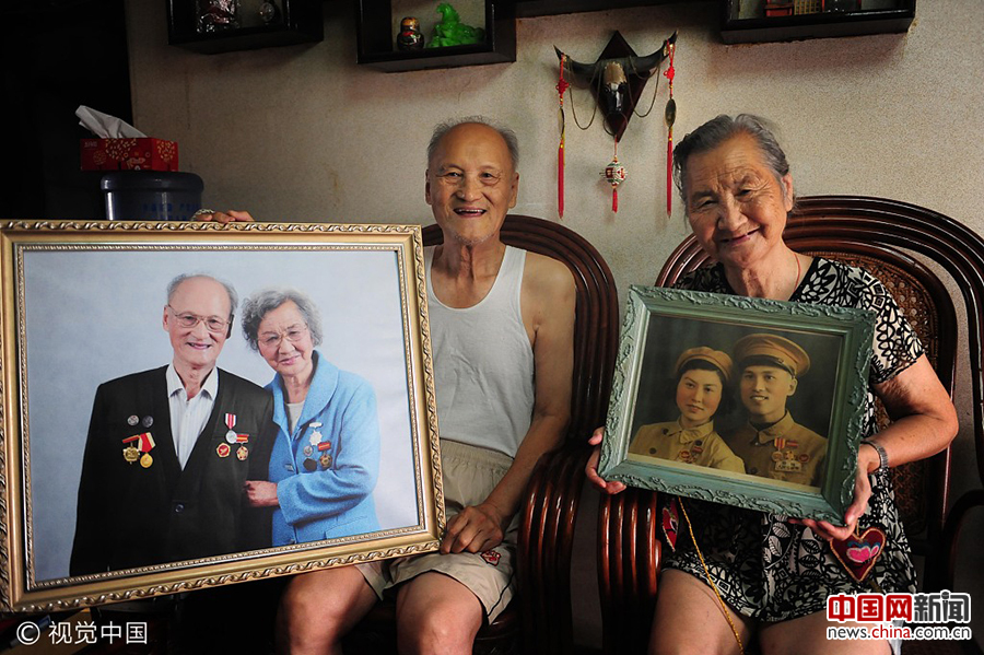2012年8月22日,江苏省扬州市虹桥社区念四新村,两位老人展示抗美援朝战争结束后于1954年拍摄的结婚照(右)和金婚时的合照,迎接传统“七夕节”。DH/视觉中国