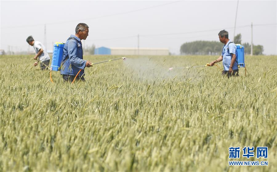 5月21日,河北省阜城县古城镇前宋村农民在麦田喷洒农药。