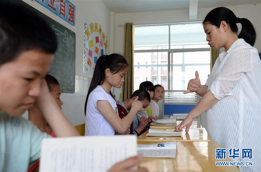 5月20日,在新干县特殊教育学校,张芸(右一)在辅导学生做作业。新华社记者 彭昭之 摄