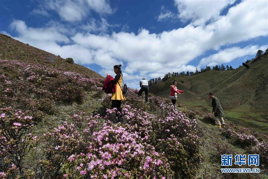 5月21日,游客在兰坪河西乡大羊场观赏高山杜鹃花。