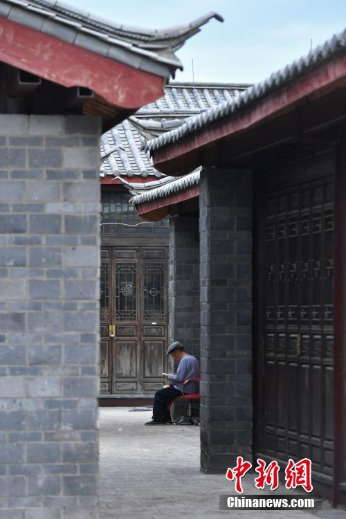 一老人坐在丽江束河古镇内的商铺前。 中新社记者 任东摄