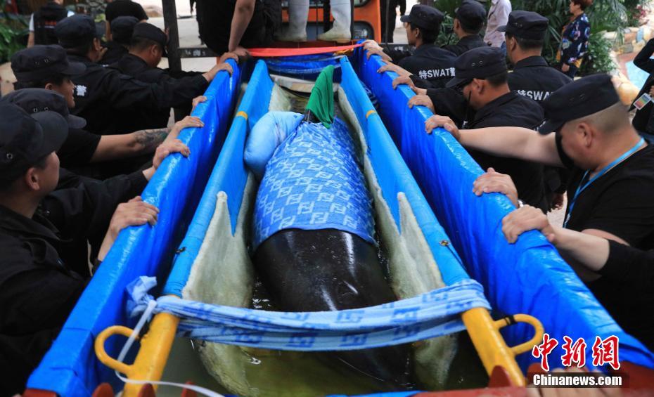 海豚正从运输车中卸下。 中新社记者 王舒 摄