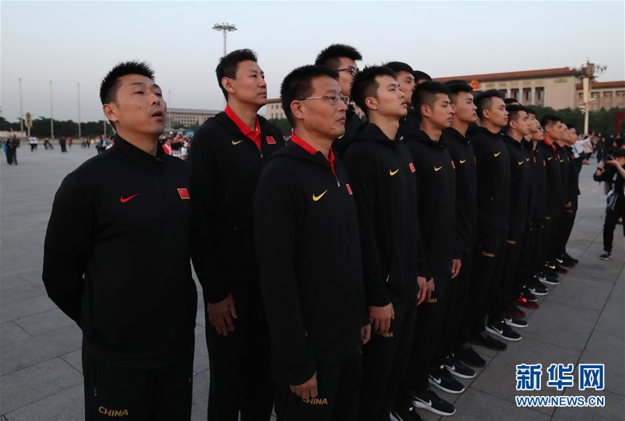 5月26日,中国男篮红队成员在升国旗仪式上。当日,中国男篮红队的教练、队员及球队工作人员来到天安门广场观看升国旗仪式,进行爱国主义教育。新华社记者孟永民摄