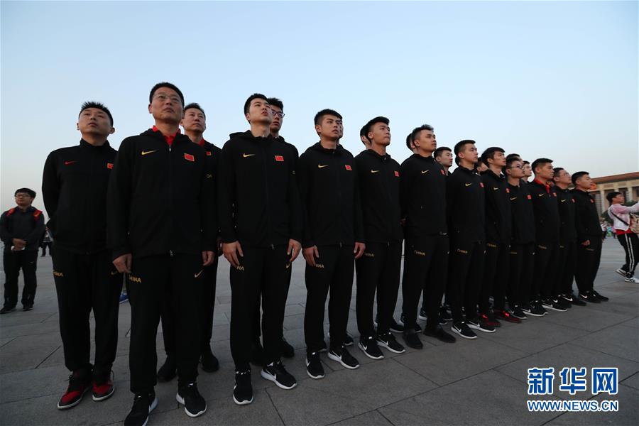 5月26日,中国男篮红队成员在升国旗仪式上。当日,中国男篮红队的教练、队员及球队工作人员来到天安门广场观看升国旗仪式,进行爱国主义教育。新华社记者孟永民摄
