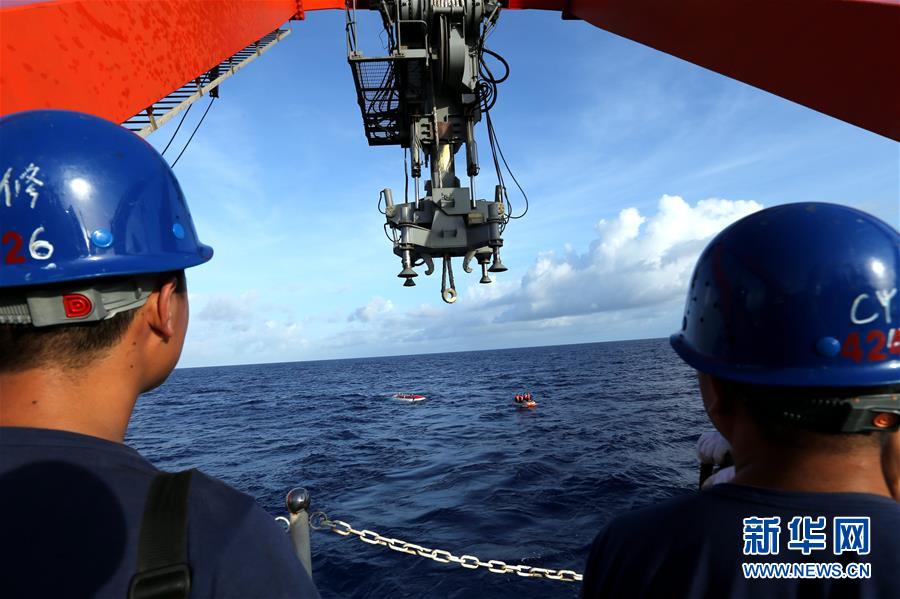 5月25日,布放“蛟龙”号入水的工作人员注视着“蛟龙”号和“蛙人”。新华社记者 刘诗平摄
