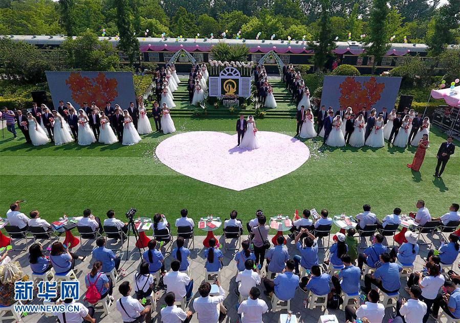 5月26日,参加婚礼的新人依次步入婚礼现场。当日,郑州铁路局青年职工集体婚礼在郑州黄河游览区举行。在钢轨、车厢等铁路元素为主题的场景中,46对新人喊出爱的誓言,步入婚姻殿堂。新华社记者李安 摄