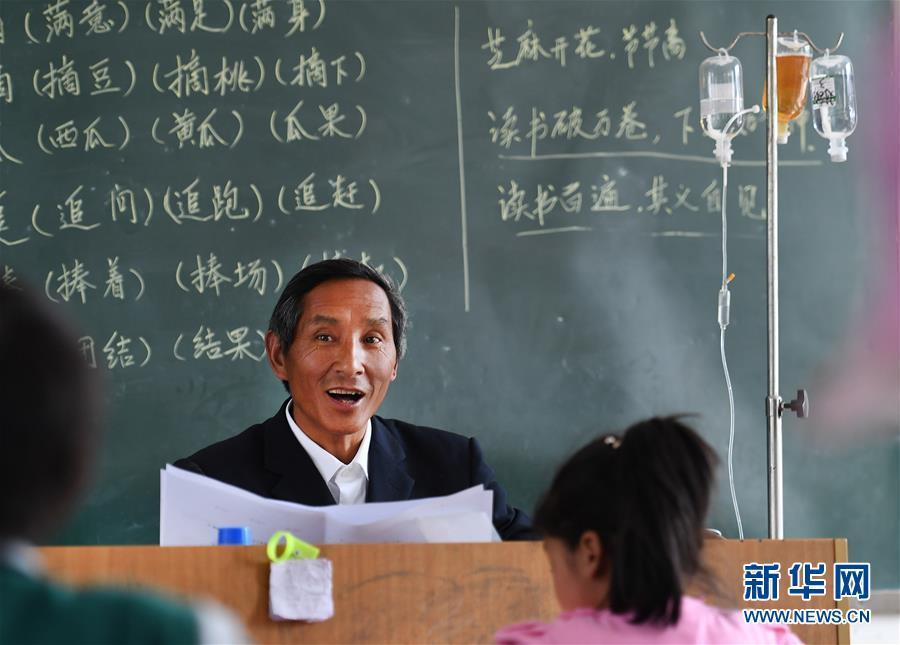 近日,陕西省宁强县胡家坝镇龙王小学53岁的刘启松患上感冒,连日吃药不见好转,便去学校门口的村医务室输液。为了不影响给孩子们上课,他便将输液架移到教室里。5月24日,刘启松边输液边上课的情景被同校老师用手机悄悄拍下来并上传到朋友圈,受到广泛关注。新华社记者陶明 摄 图片来源:新华网