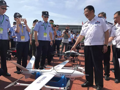 在开幕式现场,公安部装财局副局长、警用航空器办公室主任毛甫金(右三)检阅参赛队垂直起降固定翼无人机,并给予了高度评价。