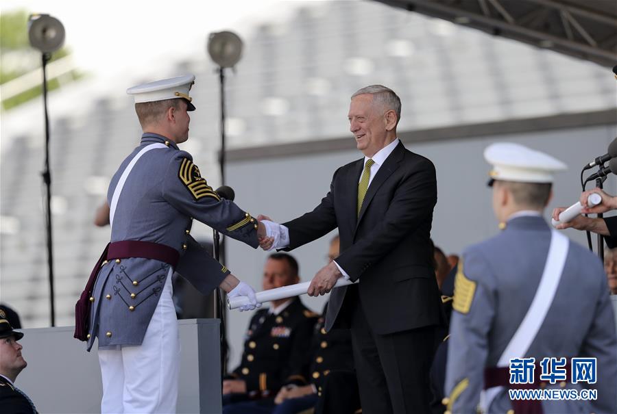 5月27日,在位于美国纽约州北部的西点军校,美国国防部长马蒂斯(右二)为毕业学员颁发证书。