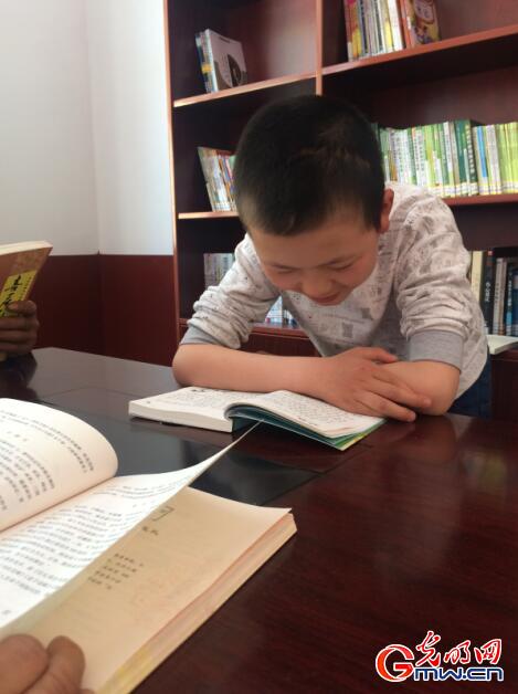 因病休学在家的留守儿童刘欣源是书屋的第一个读者。(唐湘岳摄)