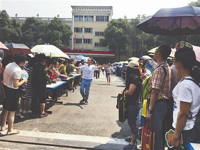 5月28日上午11时,成都外国语学校小升初本地生面谈陆续结束,学生开始三三两两走出校门。由于人数众多,成外分别设置了“男生出口”和“女生出口”,数千家长不顾炎炎烈日,早早地在出口外的道路两旁排着长队等候。