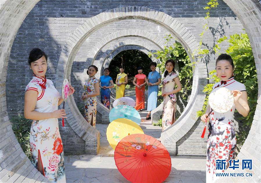 5月28日,旗袍爱好者在泰州三水湾景区展示旗袍。
