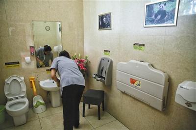 5月29日,北京动物园内,保洁人员在打扫第三卫生间内的卫生。新京报记者 彭子洋 摄