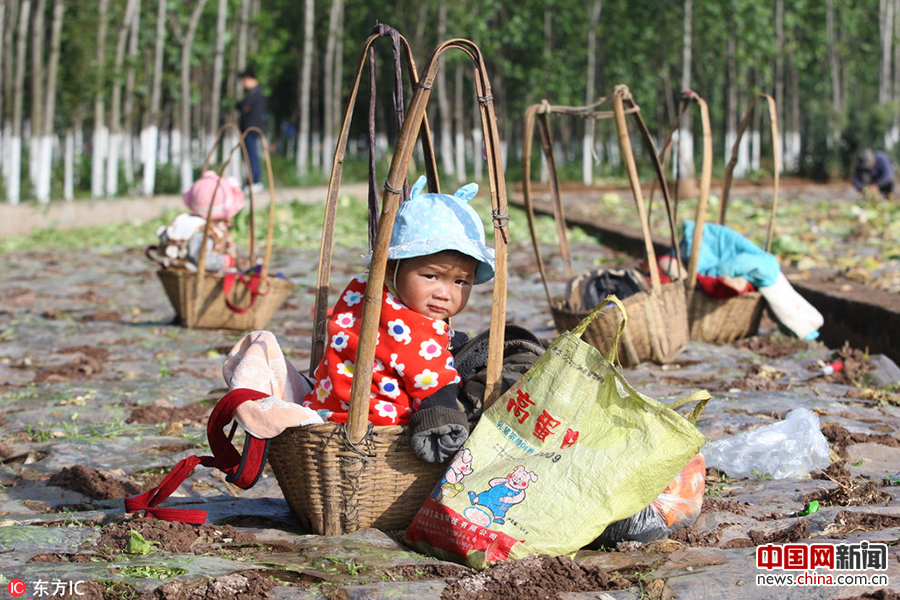 2017年5月31日报道,清晨,在云南省通海县的蔬菜基地,晶莹的露水还没从菜叶上掉落,菜地里已经一派忙碌的场景。数千余名从事蔬菜收割的打工者正在田间砍菜、挑菜、装菜。而此时,就在他们不远处,他们的孩子正三五成群,坐在被放置在菜坑上的竹篮里,等着父母忙完前来“哺育”。有人把这些孩子叫“竹篮娃娃”。这些孩子大都来自农村,随父母从外地来通海县做蔬菜采收工作,由于蔬菜采收工作地不确定,收完一块菜地很可能要奔波数公里才能到下一工作地。孩子们也只能随着父母在菜单间过着“游牧”的生活。