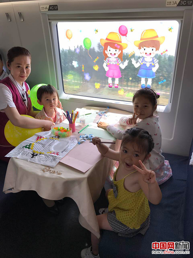 六一国际儿童节,为营造“文明、健康、和谐”的乘车氛围,北京客运段高铁二队值乘的G55次列车上特别推出“我们一起过六一”的亲情服务活动。