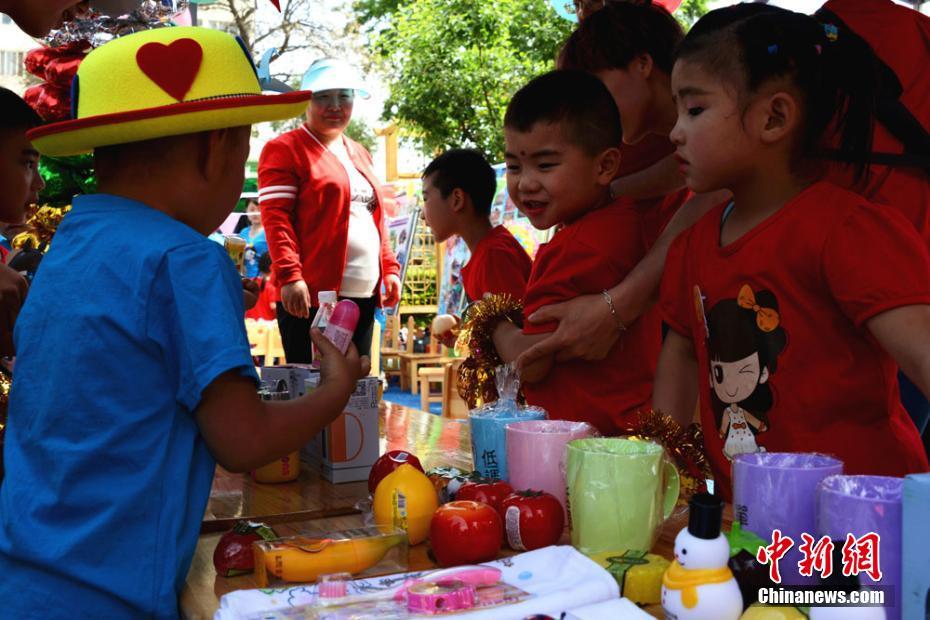 兰州七里河秀川幼儿园通过举行“跳蚤市场”庆祝“六一”儿童节。李浩 摄