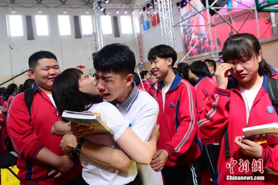 6月3日,学生与老师拥抱在一起。当日,内蒙古呼和浩特第一中学举办毕业典礼,为1200余名高三学生鼓劲高考。 中新社记者 刘文华摄