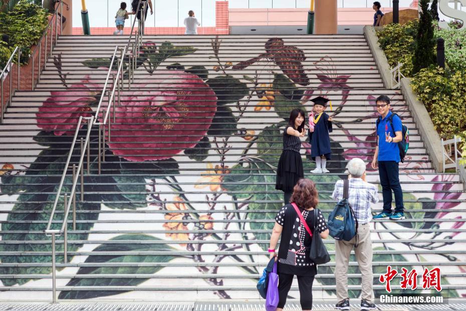 刚毕业的小朋友在沙田大会堂的艺术阶梯上和家人一起拍摄毕业照。该阶梯以关联昌的《蝶与花》为主题,这幅作品融合了中西画法,鲜艳夺目又刻画细致。中新社记者 谢光磊 摄