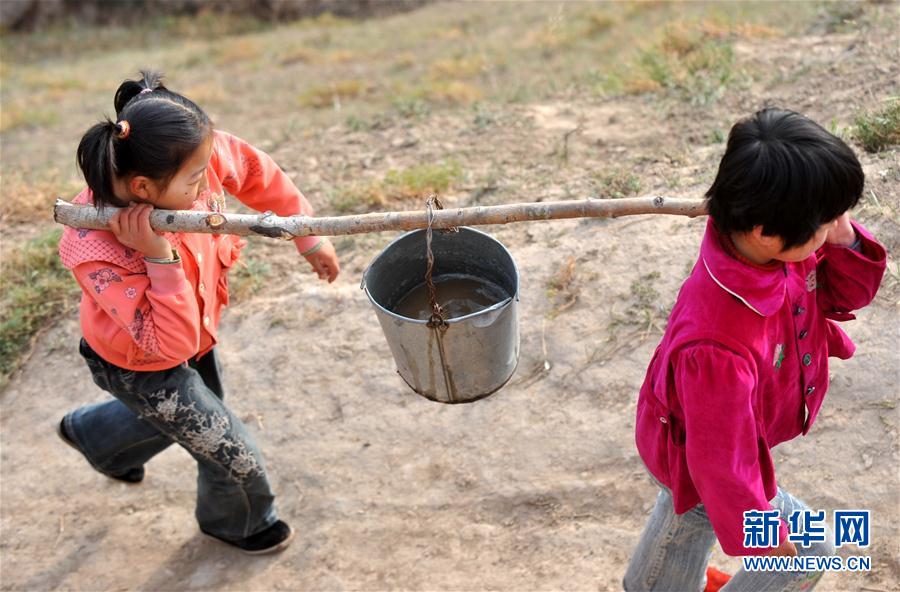 8年前,10岁的王琼(左)和同学挑水走在家乡崎岖的山路上(2009年10月24日摄)。 新华社记者 聂建江 摄