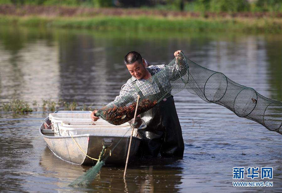 6月7日,一位农民在湖南南县明康龙虾养殖专业合作社的稻田里收虾。新华社记者 李尕 摄