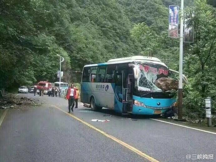 大巴行驶中 巨石从而天降砸烂驾驶室